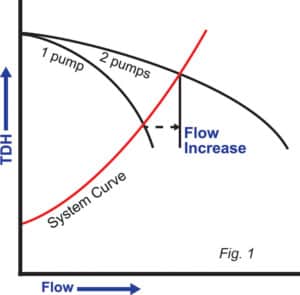 例如,假設(shè)有一組固定噴嘴,其中系統(tǒng)阻力是純摩擦的,并且僅作為流量變化的結(jié)果而變化。當(dāng)引入第二個泵時,系統(tǒng)中的阻力會隨著流量的增加而增加。