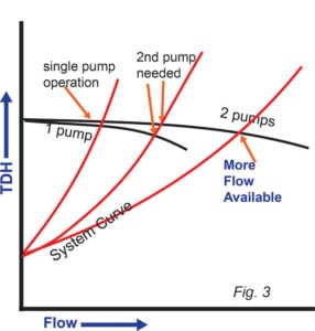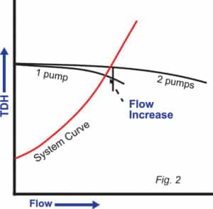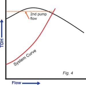 在圖 4 中,系統(tǒng)曲線和 TDH 曲線在大于關(guān)閉 TDH 值的 TDH 和低于曲線的最大 TDH 的 TDH 處相交。當(dāng)?shù)诙€泵啟動時,流量將僅增加到 TDH 與系統(tǒng)壓力匹配的第一個點(diǎn)。