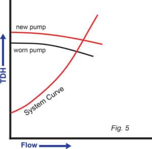 當(dāng)一個泵磨損時,可能會出現(xiàn)類似的情況。這在圖 5 中有所提及。隨著泵的磨損,在任何給定流速下產(chǎn)生的 TDH 量都會減少。如果新泵與系統(tǒng)曲線的交點(diǎn)并聯(lián)在磨損泵的關(guān)閉TDH之上,它將迫使磨損泵進(jìn)入關(guān)閉狀態(tài)。
