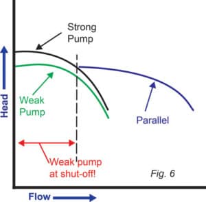 如果一個泵表現(xiàn)出較低的關(guān)閉 TDH 特性,它將在關(guān)閉狀態(tài)下運(yùn)行,直到主導(dǎo)泵在其曲線上移動足夠遠(yuǎn),以至于其 TDH 低于具有較低揚(yáng)程的泵的關(guān)閉 TDH(圖 5 )。