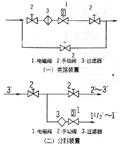 3、在電磁閥發(fā)生故障時,為了及時隔離電磁閥,并保證系統(tǒng)正常運行,最好安裝旁路裝置(如圖一)。